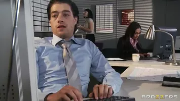 Vidéo porno : La scène commence avec une brune aux gros seins qui fait une fellation à un mec dans un open space. Elle le suce vigoureusement, faisant des va-et-vient rapides avec sa bouche et ses mains sur son pénis. Le mec gémit de plaisir, caressant les cheveux de la brune tout en regardant fixement son visage concentré sur sa tâche. La brune continue de le sucer sans relâche, faisant preuve d'un grand talent pour la pipe. Ses lèvres sont étirées autour du gland du mec, et elle le regarde droit dans les yeux pendant qu'elle le fait. Le mec sent monter la pression et ne peut s'empêcher de grogner de plaisir. Finalement, après avoir joui dans la bouche de la brune, il retire son pénis et lui dit : « Maintenant c'est toi qui va y passer ! » Elle acquiesce sans hésitation, écartant les jambes pour offrir une vue imprenable sur sa chatte humide et glabre. Le mec n'a pas besoin d'être invité deux fois - il plonge directement sa langue dans son vagin, lapant avidemment chaque centimètre carré de sa vulve. La brune gémit bruyamment alors que le mec continue de la lécher avec passion. Il insère plusieurs doigts en même temps, faisant des mouvements circulaires pour stimuler