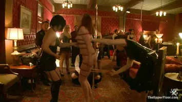 Vidéo porno : Au milieu de la pièce une soumise est dans une drôle de position et les invités qui sont pour la plupart des dominateurs ou dominatrices lui donnent des coups de baguette. D'autres soumises sont conviées à cette soirée. L'une d'elle reçoit une sacrée fessée et ses fesses sont toutes rouges. Une autre soumise porte des élastiques et les gens s'amusent à les faire claquer sur son corps. Les coups de fouet et de martinet font partie de cette séance sm sans compter les humiliation sous diverses formes. Les tasers sont là également et certaines femmes dominées prennent leurs pieds en recevant des décharges électriques.