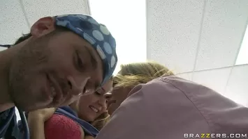 Il se branle entre les pieds d'une blondasse et lui gicle dessus