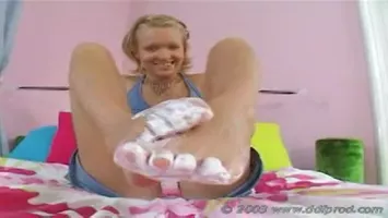 Blonde se lave les pieds et les orteils, avant de les caresser et les lécher