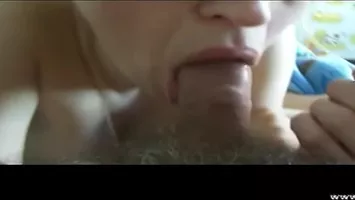 Brunette aux belles lèvres pompe la bite géante d'un veinard et le fait jouir