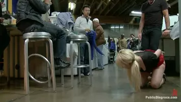 Vidéo porno : Le couple de pervers emmène une soumise docile dans un lieu public afin de l'humilier devant des gens. Dans cette laverie la femme dominée doit lécher des pieds et des chaussures. Certains mecs en profitent pour lui tripoter sa chatte. Le maître lui enfonce un gros manche dans son anus.