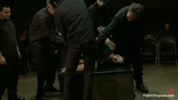 Vidéo porno : La maîtresse aime s'occuper de ses soumises en public alors elle organise régulièrement des soirées spéciales. Dans ce clip vidéo vous verrez qu'elle met sa soumise à la disposition de pervers. Certains lui lèchent le minou et l'anus, d'autres lui donnent une fessée mais là où les gens prennent du plaisir c'est lorsque la soumise est ligotée et qu'ils peuvent se faire sucer la bite. La dominatrice lui accroche des pinces à linge le long du corps qu'elle va retirer en lui donnant des coups de martinet. La femme dominée se prend des bites dans l'anus aussi pour l'humilier totalement.