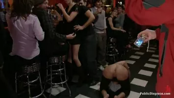 Vidéo porno : C'est une vidéo très hard que vous allez découvrir et qui ne vous laissera pas de marbre. Vous allez assister à une réelle humiliation publique. La blonde adore le sexe et les nouveaux défis ne lui font pas peur. C'est dans un bar que la blonde va se faire humilier par toute la clientèle. La coquine nymphomane a le droit à la totale. Le début est gentil car on lui asperge de la bière et on lui fait lécher les semelles de chaussures. Mais une fois que l'esclave est ligoté, ça devient hard et là elle se fait défoncer ses orifices par des gros godes et des doubles pénétrations.