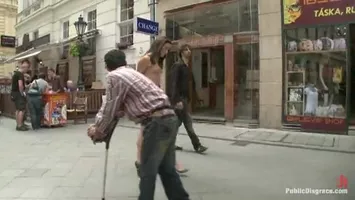 Vidéo porno : En plein centre ville cette soumise se promène les seins à l'air et a les bras ligotés dans le dos. Son maître lui relève sa jupe aussi pour qu'on voit sa chatte. Dans le bus le maître lui donne une fessée en public et la fait marcher à quatre pattes avant de se faire sucer la bite.