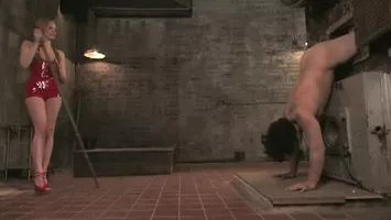 Vidéo porno : La maîtresse a enfermé un soumis dans un sorte de four et elle le frappe. Uns fois que l'homme soumis est libéré la maîtresse le frappe avec un paddle et le soumis jubile grave mais il en redemande alors la dominatrice lui triture sa bite et lui en fait voir de toutes les couleurs.