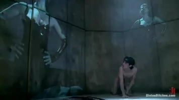 Vidéo porno : Le soumis se retrouve tout nu et les yeux bandés dans une cellule. A travers les parois de la vitre sa soumise lui ordonne de se frapper lui même avec un martinet. Lorsque la dominatrice entre dans la pièce elle le frappe à son tour mais très vite elle s'intéresse à son anus pour le dilater et le défoncer.