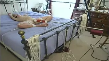 Vidéo porno : Ligotée sur un lit la soumise a des ventouses à ses seins pour se faire étirer les tétons et un stimulateur posé sur son point g. La maître prend son pied en la voyant comme ça et pour encore plus de plaisir il lui donne des coups de martinet. La femme dominée a les seins ligotés et elle doit chevaucher une machine pour jouir.